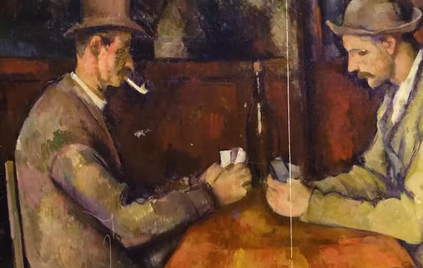 The Card Players Painting. This is a famous painting by Paul Cézanne. It shows two people sitting at a table playing cards. However, this painting is not a single painting but was painted in 5 different versions in the 1890s. Each of which shows ordinary people sitting at a wooden table playing cards intently.